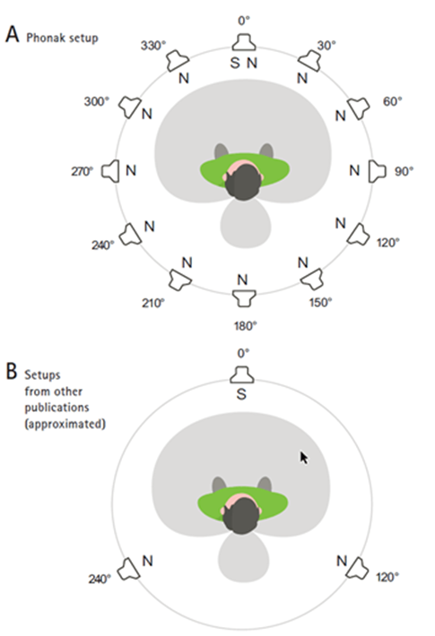 1. ábra: A: Phonak beállítás, zajforrások minden irányból a valósághű értékeléshez. B: Versenytárs beállítás, zaj 120°-nál és 240°-nál, túlbecsülve a mikrofon teljesítményt.