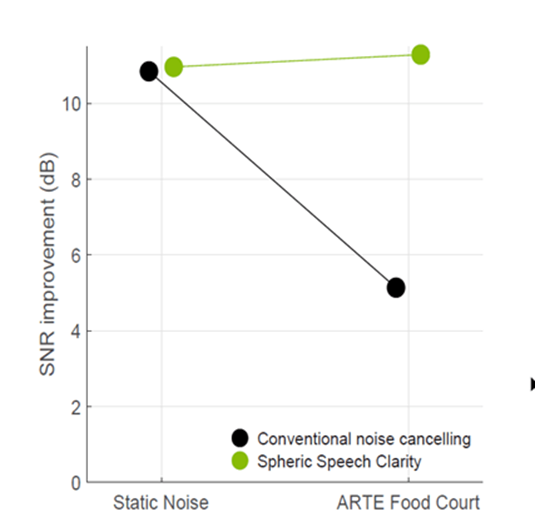 Statikus zajban a Spheric Speech Clarity és a hagyományos zajcsökkentés hasonló SNR-javulást mutat. Valós környezetben azonban a Spheric Speech Clarity fenntartja az SNR-javulást, míg a hagyományos zajcsökkentés hatékonysága 50%-kal csökken.